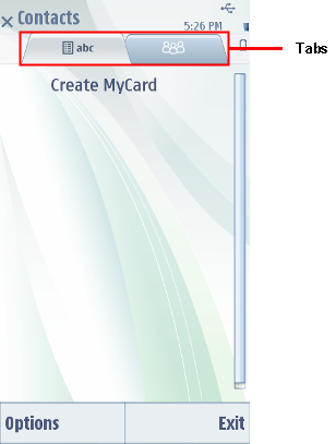 The Symbian UI supports tabs, which allow you to collect information for a state onto different pages. These tabs exist in the same node of the navigation hierarchy. The concept of tabs is related to the term view .