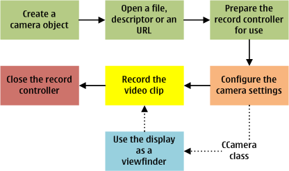To record video data to a file, descriptor, or an URL, use the video recorder utility of the Multimedia Framework (MMF) to develop your application. To make use of the onboard camera to capture a video clip, the application needs to repeat the steps described in the illustration below.