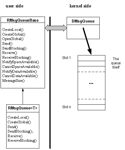 A message queue is represented by a DMsgQueue kernel side object, to which the reader and the writer can open a handle, a RMsgQueue object. A message queue is a reference counted object, being derived from CObject , which means that it is not persistent; it is deleted when the last handle to it is closed. The queue itself is simply a block of memory divided into slots, managed by the DMsgQueue object.