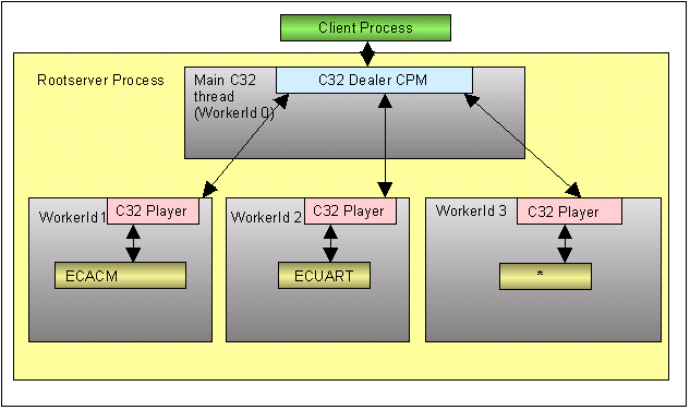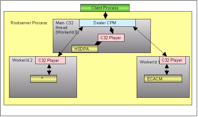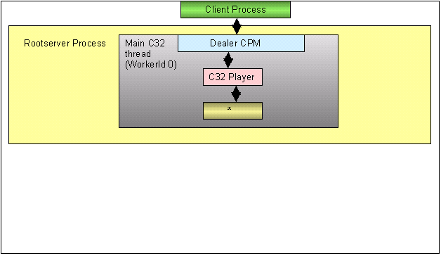 C32 Multithreading uses the same Dealer/Player terminology/concepts as Esock Multithreading. The Dealer is the main C32 Comms Provider Module (CPM) which runs the C32 server; a Player is a C32 CPM that only runs one or more CSYs and takes the client requests from the Dealer module.