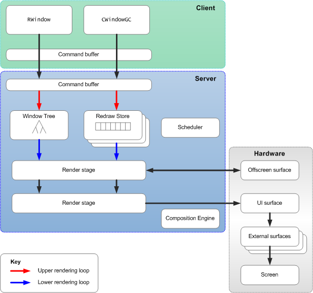 The upper loop processes the server-side command buffers. RWindow commands are processed as updates to the window tree . CWindowGc commands are processed as updates to the redraw stores .