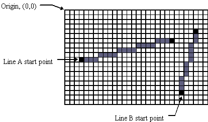 The distribution of pixels is fairly straightforward if the x-delta is an exact multiple of the y-delta, or vice versa. In this case there are the same number of pixels in each pixel line step (as in the case of line A). When the x-delta is not an exact multiple of the y-delta, (or vice versa) the pixels in the pixel line cannot be distributed evenly so the pixel line steps each have differing numbers of pixels (as in the case of line B).