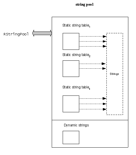 A string pool is referenced through an RStringPool , which is a handle like object. The following diagram illustrates the basic idea: