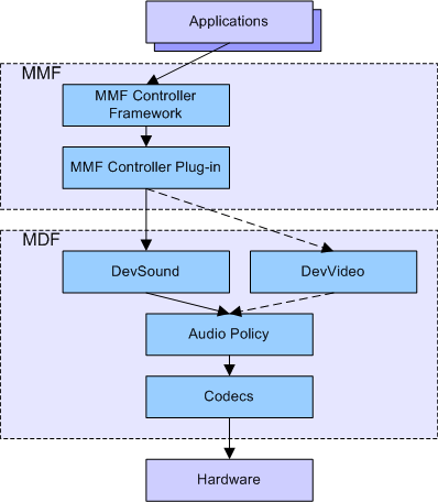Depending on the functionality required by the client, the MMF controller framework loads the appropriate controller plug-ins. The plug-ins perform the required operations by communicating with DevSound and/or DevVideo, codecs and hardware.