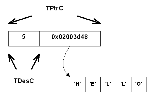 The base class, TDesC , contains a data member which holds the length of the data. The following drawing shows the layout of a TPtrC object for a string of five characters representing the English word "Hello".