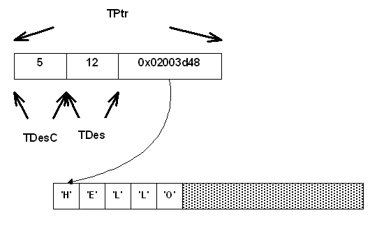 The base class TDesC , contains a data member that holds the length of the data. The base class TDes , contains a data member that holds the maximum length of the data. The following drawing shows the layout of a TPtr object for a string of five characters representing the English word "Hello". The maximum length to be represented by the descriptor is 12.