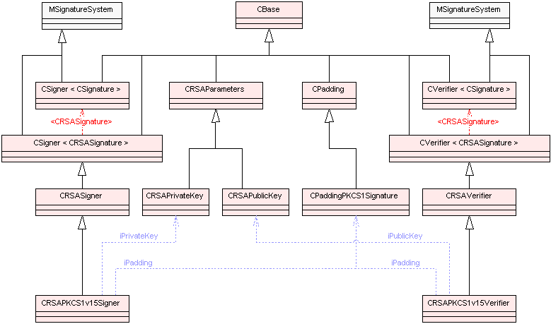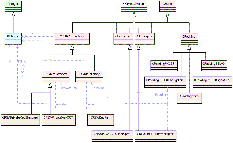 The diagrams below show the main classes used in asymmetric cipher framework. Blue dotted arrows indicate that a class is contained or used by another class. The arrows are labelled with the variable(s) through which the pointed class is accessible. The color of the boxes indicates the type of Symbian class, i.e., M , C , R or T class. For detailed information on each component see the Cryptography API Reference material.