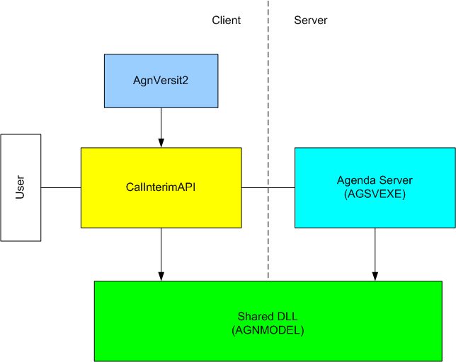 Calendar is a single component that contains: Agenda Server, AgnModel and CalInterimAPI. CalInterimAPI contains classes that hold information about calendar entries. AgnModel is a DLL which is shared across the client and the server. Agenda Server provides calendar file management on behalf of all clients.