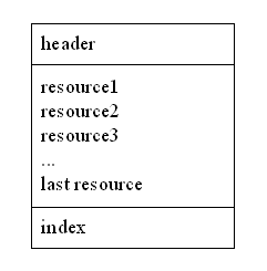 A resource file is generated from text input using the resource compiler. The index can be used to efficiently find a resource given its numeric ID. There can be 1 to 4095 resources in a resource file. Each resource contains binary data whose length is determined by subtracting the start position of the resource from the start of the next resource (or from the start of the index, for the last resource in the file).