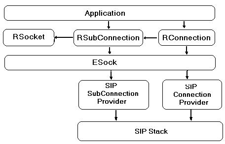 An endpoint, for example a SIP enabled phone, that wants to start a SIP session must use RConnection to register with the SIP registrar. For more information about RConnection, see Connection Management . ESOCK provides an interface for the user to access the SIP high level API. ESOCK interacts with the SIP high level API through the Connection and SubConnection providers. Connection and SubConnection providers are ESOCK server side components that are loaded and called when RConnection and RSubConnection APIs are used.