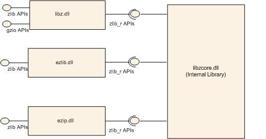 EZLib provides three DLLs which encapsulate the core functionality in Symbian C++ and Open Environment APIs.