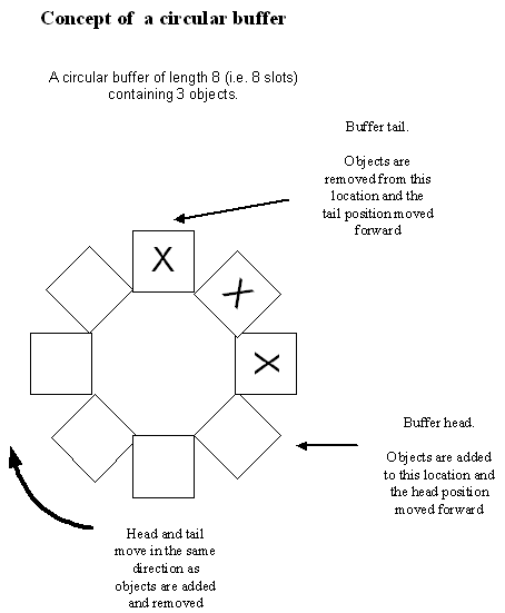 A circular buffer provides a simple way of implementing a fixed length queue of fixed size objects where objects are added to the head of the queue while items are removed from the tail of the queue.