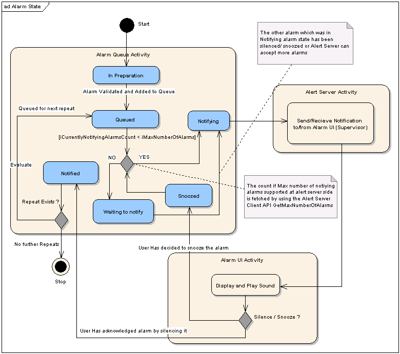 At a given point of time, alarms can be in only one state, which is represented by TAlarmState . The following diagram is self-explanatory and represents the state transition of alarms: