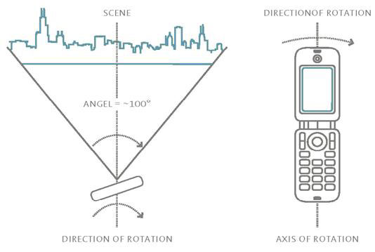 Note: You must try not to move the mobile phone, but only rotate it. You see in the below diagram the camera is sweep in a clockwise direction from left-to-right. The rotation is made around the imagined axis through mobile (axis of rotation in the image). A panorama image covers approximately a 100 degree field of view.