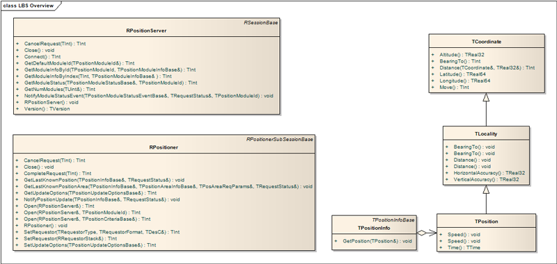 Figure 1 illustrates the client interface classes of the Location Acquisition API including the data classes that hold basic location information. The classes shown are defined in the header file lbs.h . See Location Acquisition API reference for a full list of all the API header files.