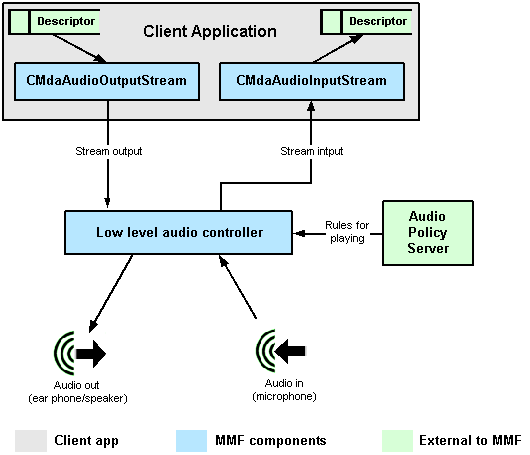 How the Audio Output Streaming classes interact with other components of MMF is shown below: