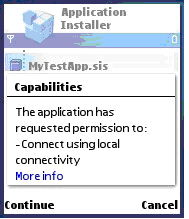 During the installation the Software Installer application in the device checks whether the application has been certified or signed. It then checks the capabilities requested by the application. If the application has been certified, it checks that the root certificate is allowed to grant the required capabilities. If no problems are encountered, the installation can continue. For information on certifications required by the capabilities, see Application signing .