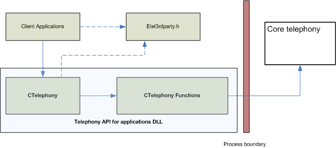 The API is implemented as static linked library etel3rdparty.dll . The library must be linked in the client applications to access the telephony functions. The client applications access the functions with the CTelephony class.