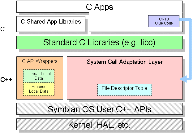 Executables built for the Symbian platform enter via E32Main() , whereas Standard C applications expect to be started from main() . It is therefore necessary to have 'glue code' (formerly known as CRT0) between these two functions. The glue code is also responsible for allocating any system resources, obtaining system and environment data, and initialising the SCAL infrastructure prior to calling the main() function of the application. There are two versions of the glue code library - libcrt0.lib (for use by applications that enter via char main() ) and libwcrt0.lib (for use by applications that enter via wide char main() ).