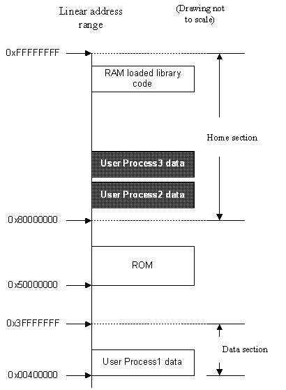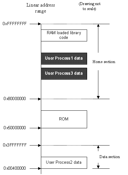 The Kernel's data and stack/heap chunks also reside in the home section. These are never visible to user processes. Code chunks for RAM-loaded libraries reside at the top end of the home section and have user read-only access, so that all user processes can execute code from a loaded library.