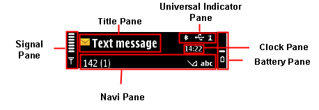 Universal indicator pane : opens a pop-up with more information on Status pane indicators. It always includes battery and signal indicators and a small digital clock. The user can tap any of those for more information. For each visible universal indicator, there is one row reserved in the pop-up for displaying the icon and a description text. The description text may also inform about the current status and/or it may be a link to a view in corresponding application. For example, a tap on "3 new messages" opens the relevant view from the messaging application, and "Bluetooth active" switches view to the Bluetooth settings. Content of the row is determined by the application originating the indicator.