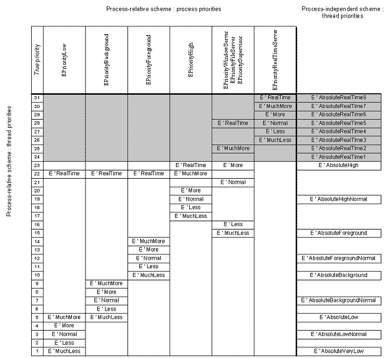 This scheme is the same as the process-independent scheme for general user threads , but with one essential difference - the range of TThreadPriority enum values to be passed to RThread::SetPriority() is as shown below. These priorities map to the true priority values in the range 24 -31, and can only be set by executables having the ProtServ capability. This range is referred to as the real time range.