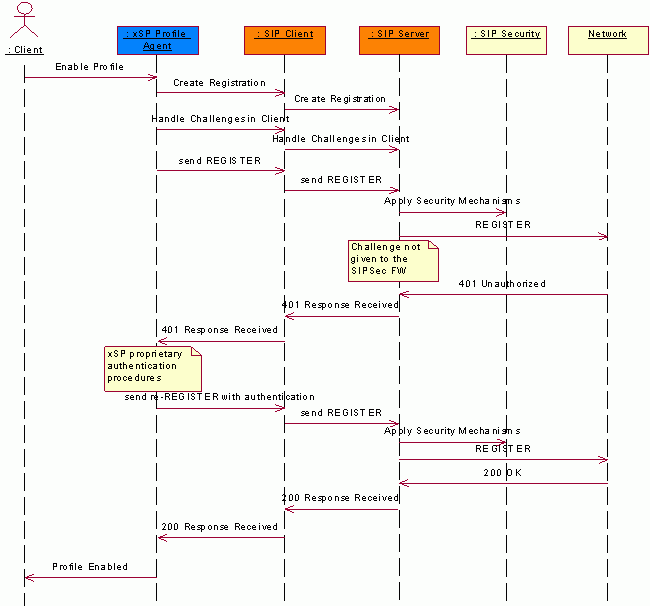 In the following illustration the client handles authentication challenges related to the profile registration. All authentication errors are then forwarded to the xSP profile agent plug-in. When an error is reported to the plug-in, it runs a proprietary authentication procedure and tries to re-register the profile.