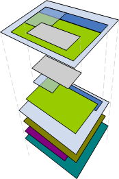 The diagram below illustrates how the display that the viewer sees (looking down from the top) is a two-dimensional representation composed from a series of layers.