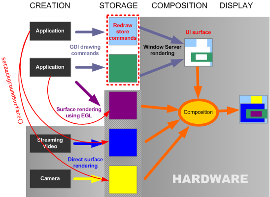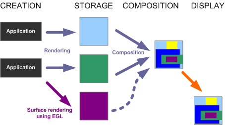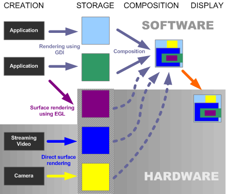 In a device with graphics acceleration hardware (a Graphics Processing Unit or GPU) there might, in addition to the memory managed by the CPU, be additional memory managed by the GPU. Image data may therefore be considered to have been software rendered (onto a surface in CPU memory) or hardware rendered (onto a surface in hardware accelerated GPU memory). The following diagram shows applications and other graphical data sources rendering to surfaces in software and hardware.