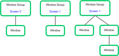 The physical screen on which the content is displayed is determined by the window's parent window group. In Symbian, every window ( RWindow ) has a parent window group ( RWindowGroup ), as shown in the following diagram. When you create a window group, you can specify the screen on which it is to be shown.