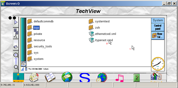 The following figure shows two Windows pointers on the emulator screen, each representing a mouse device. The ordinal integer (starting from 0) beside each pointer is the unique device identifier. The position of each mouse on the screen is represented by the X and Y coordinates. The pressure (a positive value) and proximity (a negative value) information captured by the mouse wheel is represented by the Z coordinate. Notice that the status bar shows the identifier and the dynamic X, Y and Z values of each pointer.