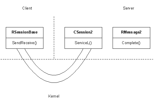 The server delivers the message to the appropriate CSession2 object, which deals with the request. The request is handled by CSession2::ServiceL() . This is defined as pure virtual in CSession2 , and is implemented by the class derived from CSession2 . When the session has finished dealing with the request, it calls RMessage2::Complete() to indicate that the service has been performed and to return a 32-bit result to the client - this is returned from the SendReceive() .