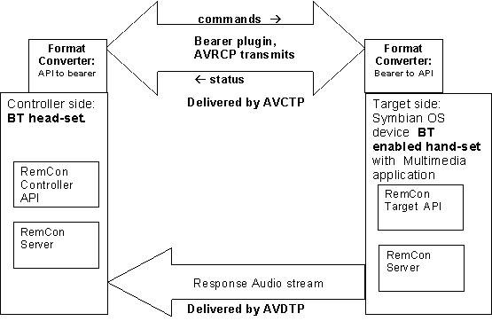 The controller application uses the Controller API, which is connected to the RemCon Server. The ECom plugin or AVRCP in this case is plugged into the RemCon server. The message format from the Controller API is converted into AVRCP format by the Converter plugin which in turn converts it into target API format at the other end. The target APIs invoke the necessary actions on the application and update the RemCon server of the status. The applicable Audio Video Distribution Transport Protocol (AVDTP) is used to deliver the output stream from the multimedia application to the controller device. The RemCon Server status is updated to the Controller through the AVRCP bearer.