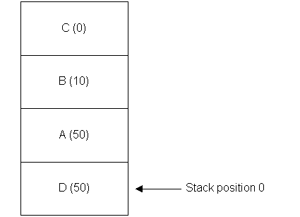 The diagram below shows a hypothetical stack containing 4 controls added in the following order: control A (priority ECoeStackPriorityDialog ), control B ( ECoeStackPriorityMenu ), control C ( ECoeStackPriorityDefault — used for application views) and control D ( ECoeStackPriorityDialog ).