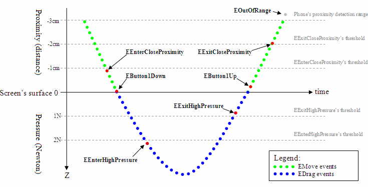 These are all types of TPointerEvent . Because these state changes depend on the pressure and proximity of the pointer, both of these values are checked each time a new TRawEvent concerning the pointer arrives from the driver. TRawEvent::EPointer3DOutOfRange means that the proximity is infinite and pressure is zero.