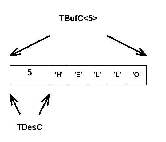 The base class, TDesC , contains a data member which holds the length of the data. The following drawing shows the layout of a TBufC<5> object initialised with the string of five characters representing the English word "Hello".