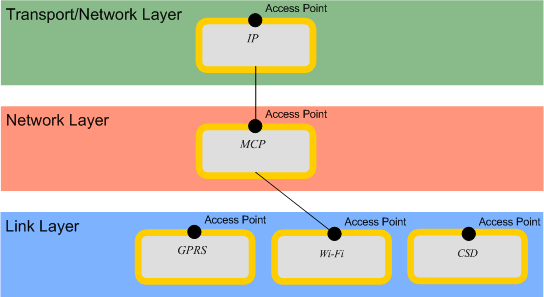 In this diagram the Link Layer has three bearers. Each bearer has an Access Point. An application or a Layer above the Link Layer does not need to know which bearer in the Link Layer is in use during the connection. The Communication Framework can replace the bearer with another bearer. The Communication Framework does not need to tell the application when the bearer changes. An application can continue to send and receive data when the change occurs.