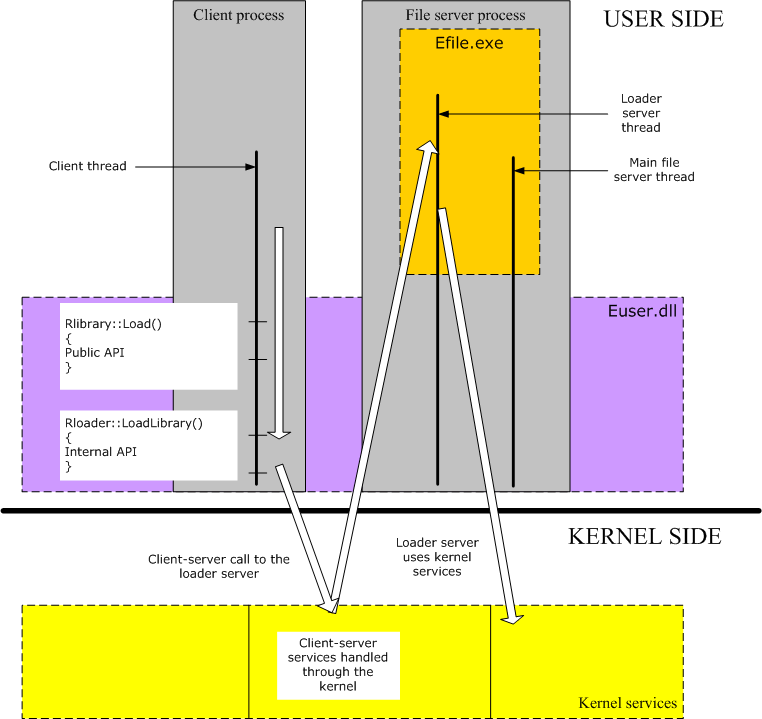 The following picture is an example of program flow. In this example, a client calls RLibrary::Load() , which exists in euser.dll . Internal functions make client-server calls to the loader server. The loader server code exists in efile.exe . The loader server uses kernel services.