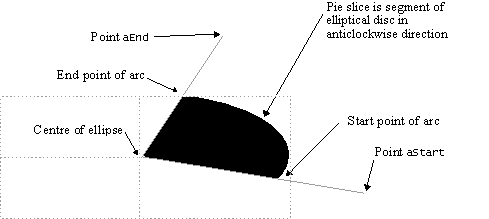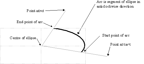 An arc is drawn as a portion of an ellipse. As well as the ellipse rectangle, the call must specify the two points: the first defines one end of a line from the geometric center of the ellipse; the point of intersection between this line and the ellipse defines the start point of the arc. The second specified point acts in the same way for the end of the arc.