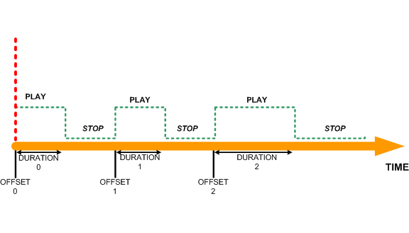 Alarm play intervals define the toggling of alarm sound playing/stopping and alarm dialog show/hide when an alarm expires. It consists of a duration and an offset. The offset is the time, in minutes, from the beginning alarm time or the end of the last snooze. The duration is the time period, in seconds, during which the alarm sound is played.
