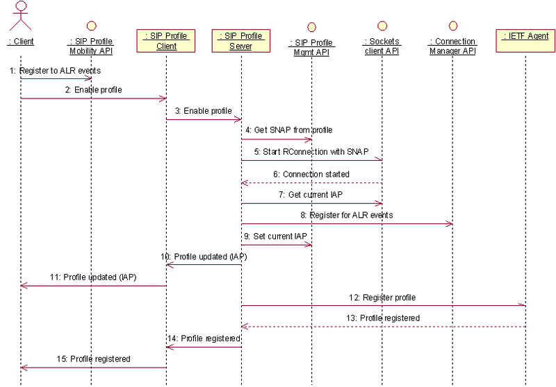 To register for ALR events, use an instance of the CSipProfileAlrController class and implement the MSipProfileAlrObserver interface to register for ALR events. When registered for the ALR event, the MSipProfileAlrObserver interface notifies the client when a SIP profile used by the client tries to migrate to another IAP. Then the client can allow or disallow the migration request using the CSipProfileAlrController::AllowMigrationL() or CSipProfileAlrController::DisallowMigrationL() functions.