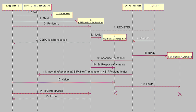 When the '200 SIP response' is received from the server side, CSIPConnection creates the CSIPResponseElements object to contain the response, and then routes the response to CSIPRegistrationBinding . CSIPRegistrationBinding attaches the response to CSIPClientTransaction . The application is informed about the response through one of the MSIPConnectionObserver::IncomingResponse() callback functions.