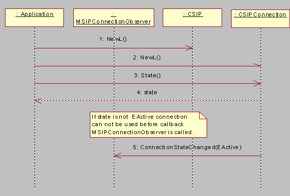 Call the CSIPConnection::NewL() function to create an active connection. The CSIPConnection::EActive state indicates that the object can be used to send SIP messages and create registrations and dialogs. The current state is asked by calling CSIPConnection::State() . The MSIPConnectionObserver::ConnectionStateChanged(CSIPConnection:: EActive) callback function is called.