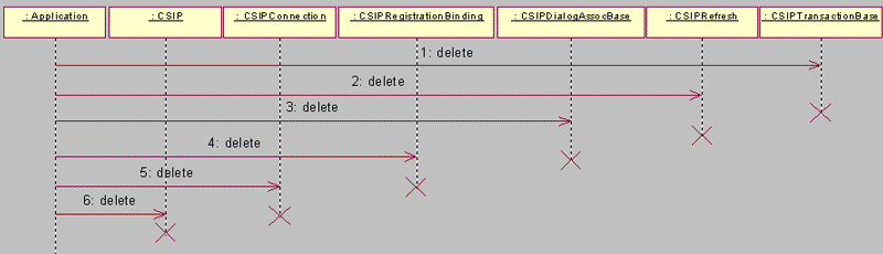 For example, if an application has CSIPConnection and CSIPRegistrationBinding objects, and it deletes the CSIPConnection object, then subsequent attempts to use the CSIPRegistrationBinding object fails. This is because CSIPRegistrationBinding cannot communicate with the server side of the SIP stack without the CSIPConnection object.