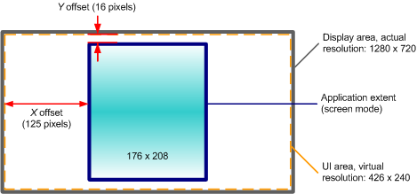 The display resolution is 1280 x 720, the application size is 176 x 208 and a virtual resolution of 426 x 240 has been introduced, which gives a scaling factor of three in each direction. All pixels are approximately square, for simplicity. The application area has been centered in the display, giving an X offset of (426-176)/2 and a Y offset of (240-208)/2, or (125, 16).