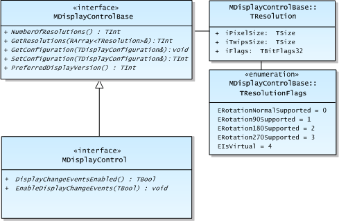 The MDisplayControl interface provides Window Server clients with functions for setting and getting the current display configuration, getting a list of available resolutions and enabling display change event notifications ( EEventDisplayChanged ). The following diagram shows the class hierarchy.