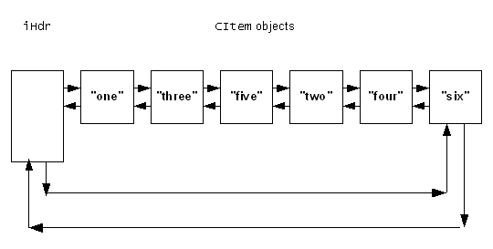 The following code fragments show how a doubly linked list can be constructed and manipulated. The list consists of CItem objects. In this example, a CItem object can contain an item of text implemented as an HBufC . The CItem objects can form elements of a doubly linked list using the iDlink data member as the link object.