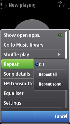 A submenu is at times used for changing the mode or temporary settings in applications. Radio buttons are used when only one item may be selected and tick marks are used where the user can choose more than one item. The indicators show the currently active mode or settings when the submenu is opened.