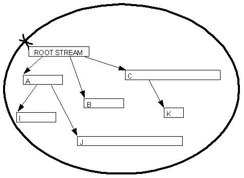 A typical relationship between a direct file store and its contained streams is shown below. In this stream network streams I and J must be written before stream A ; stream K must be written before stream C ; streams A , B and C must be written before the root stream.