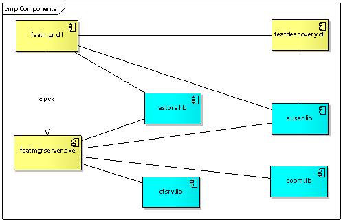 The feature manager database is also accessed by the tool feat2hdr.pl which is used at ROM build time to convert the data relating to each feature into .iby and .h files used by the source code of the components which the features refer to.